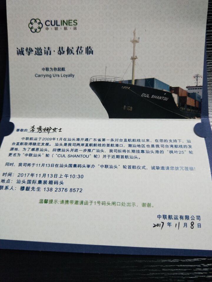汕頭誼通國(guó)際貨運(yùn)代理有限公司李秀娜總經(jīng)理獲邀嘉賓,出席此次活動(dòng),觀摩了”CUL SHANTOU”的首航.