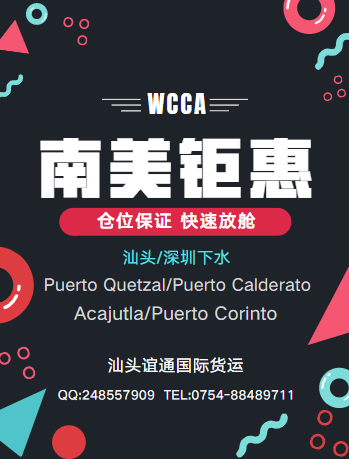 汕頭,澄海,潮陽,濠江,潮州,潮安,揭陽,普寧等潮汕地區(qū)裝柜,汕頭/深圳港到Puerto Quetzal/Puerto Calderato/Acajutla/Puerto Corinto等港口國際海運航線,更多港口航線,歡迎來電咨詢。